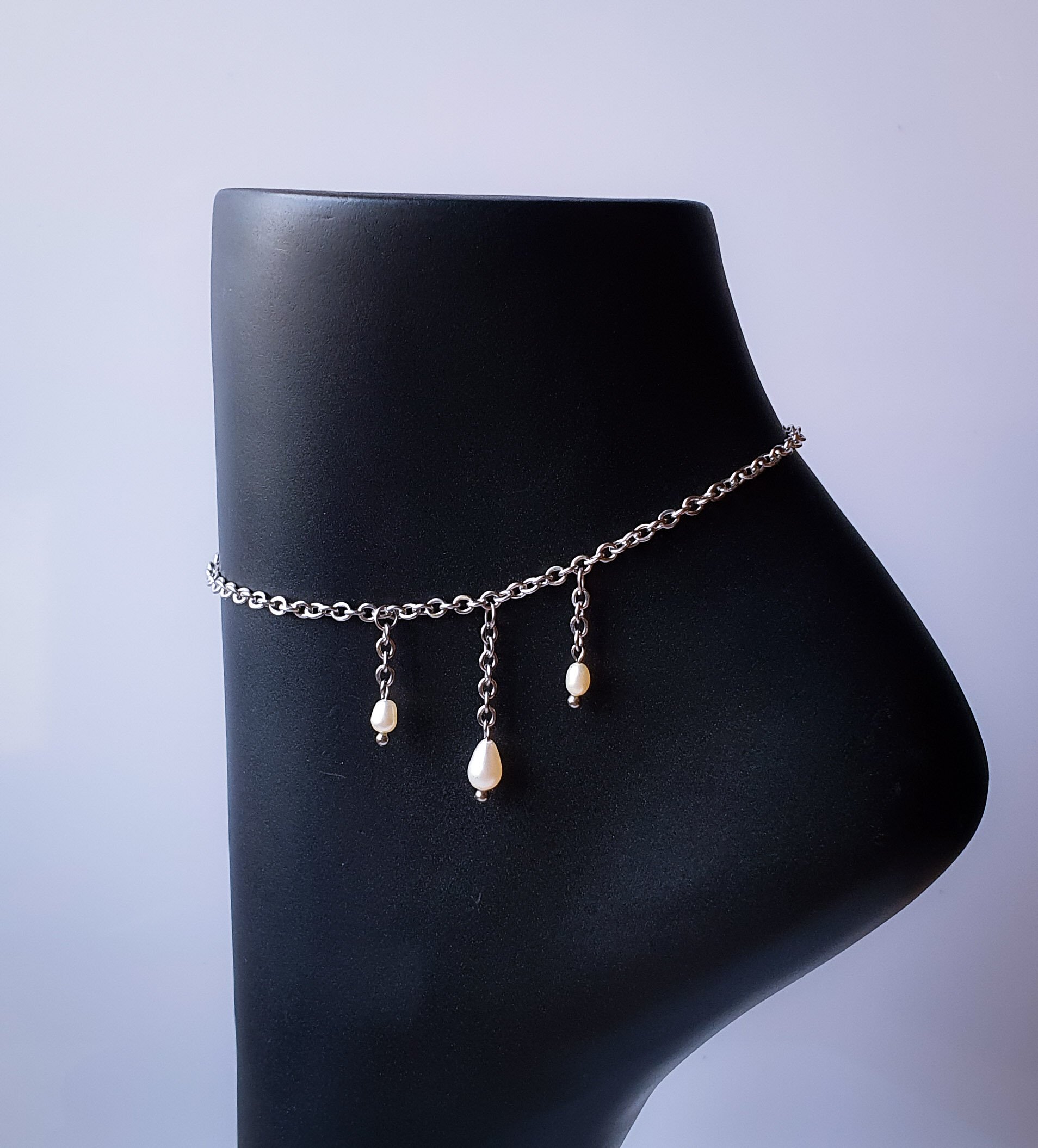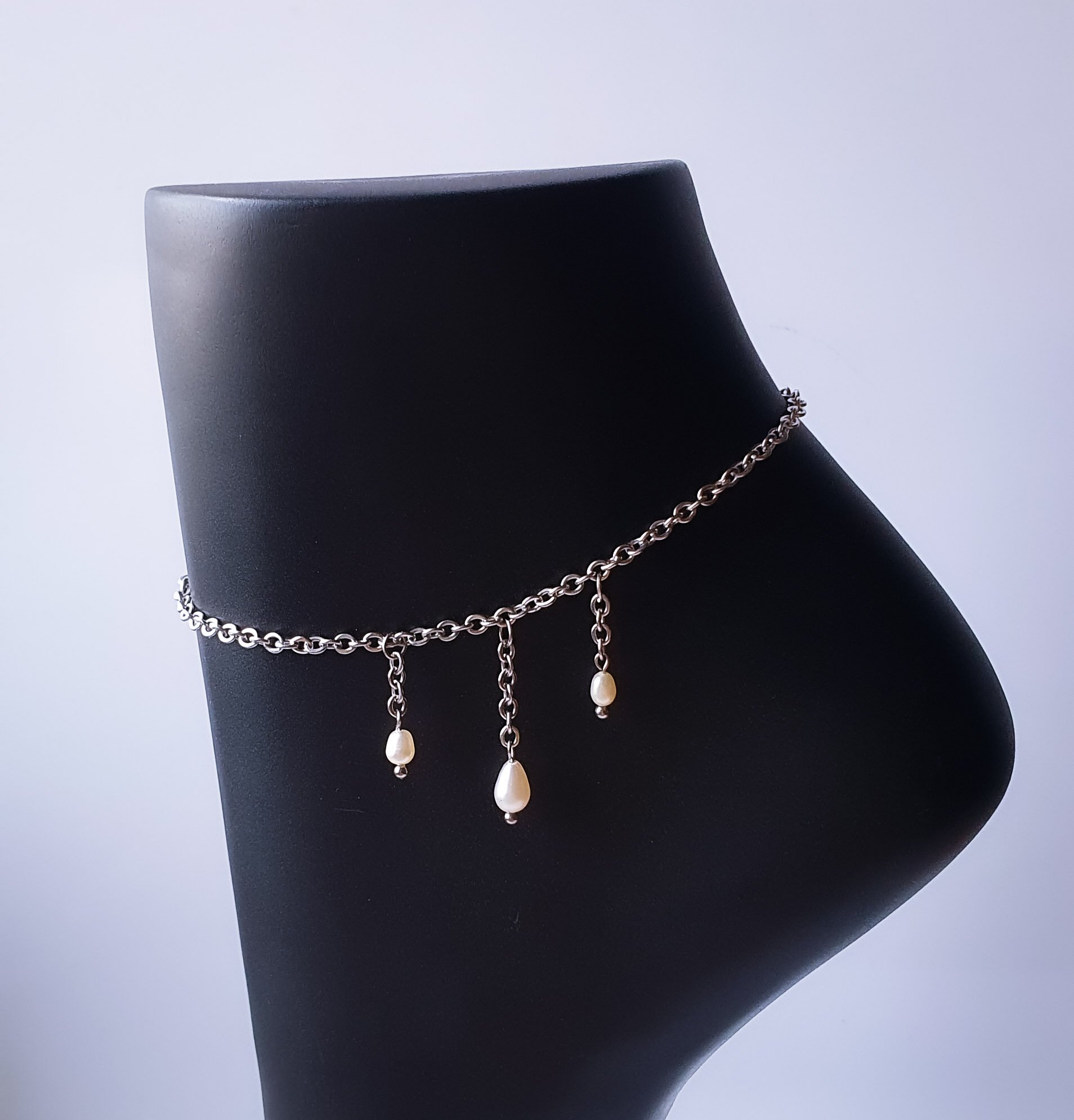 Pas de trios rice shaped fresh water pearls dangling on stainless steel chain designed to be a beautiful, delicate and undeniably alluring anklet in its minimalist simplicity.