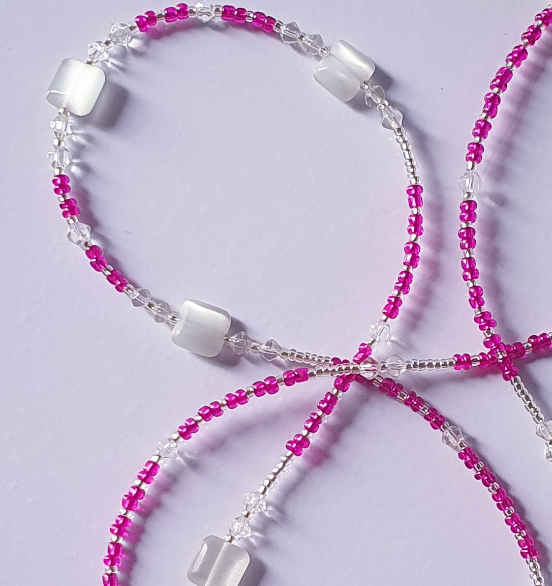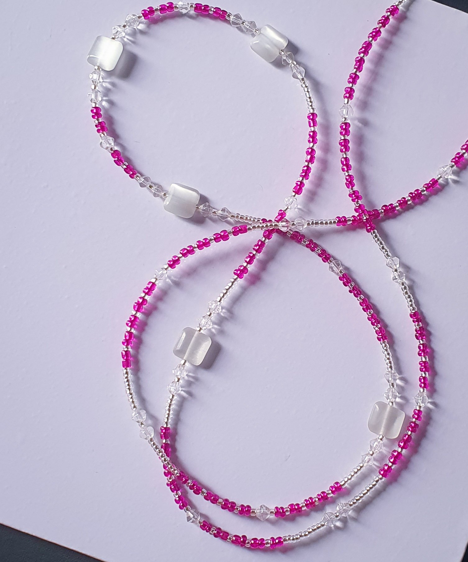 This strand balances the soft tones of classic pink and white with the architectural edge of translucent square cat-eye accents.