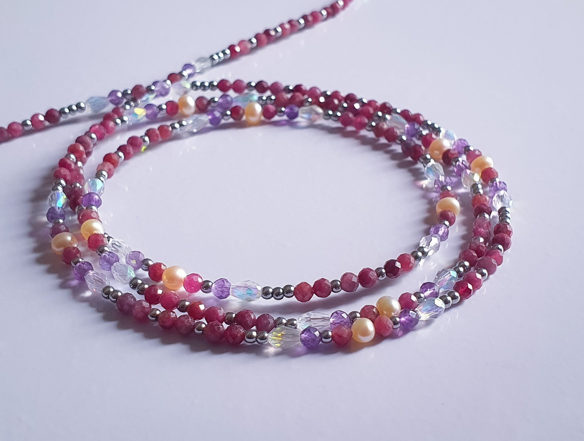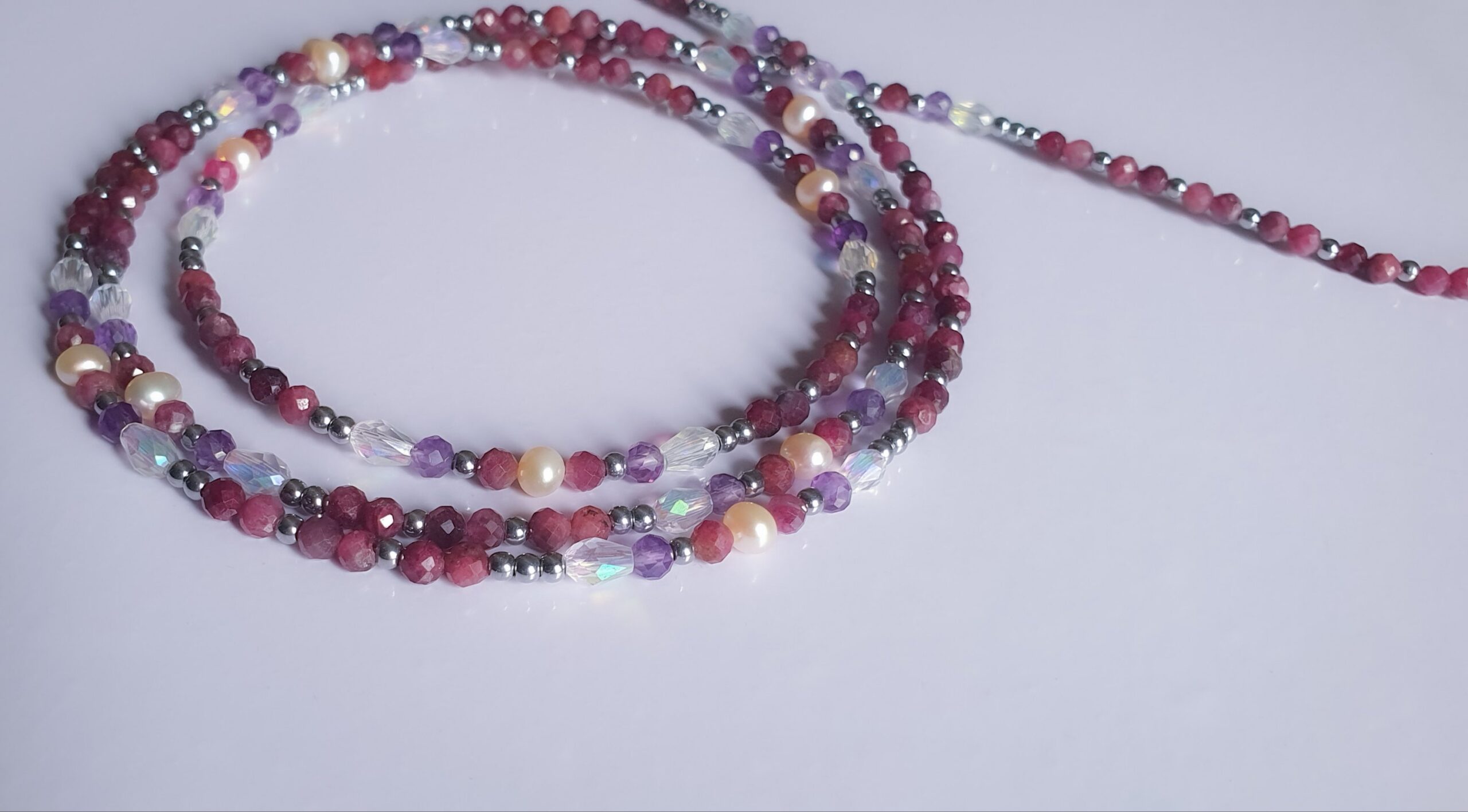 This is a powerhouse of high-vibration stones. By combining the deep, wine-colored Rubellite, the royal purple of Amethyst, and the soft luster of Cream Baby Pearls, you’ve created something that feels like a “Royal Garden.” It’s a sophisticated balance of passion, peace, and purity.